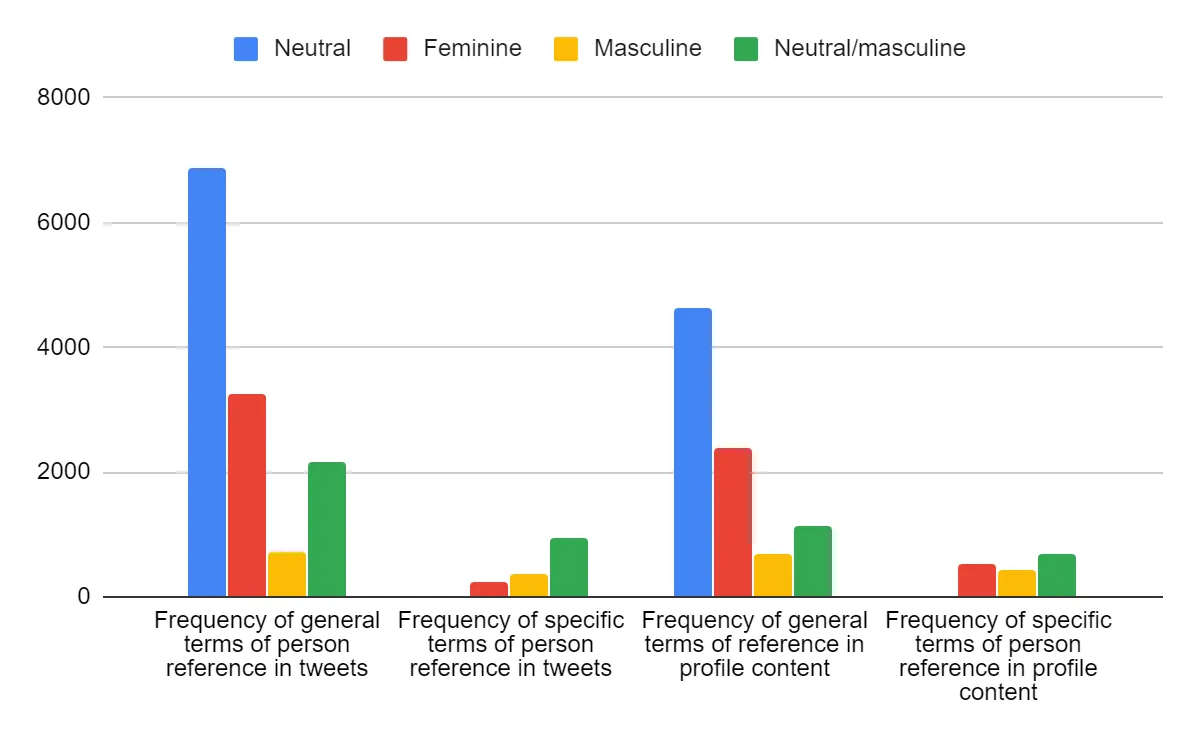 In regards to the first question, I found that gender-neutral terms of person reference are used most frequently in both tweets and profile content. Out of the gendered terms, feminine general terms of person reference are used significantly more frequently than masculine ones, while for specific terms of person reference the opposite is true. Female specific terms were only more frequent for those describing stereotypically female occupations.