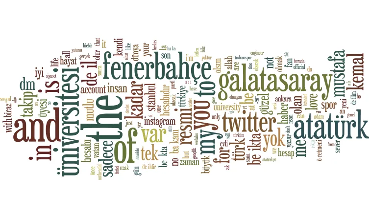 Social media texts can be useful research materials, as they offer a large amount of textual data and metadata for analysis. Due to the nature of social media language, insight can be gained into casual everyday language through this data. Twitter textual data can be divided into two parts: tweet content and profile content. Tweets can have various aims and subjects, and tend to match more closely the everyday conversational language use. Profile descriptions, names and usernames are written in order for a user to present themselves. They tend to contain more specific vocabulary used to describe the user’s life and interests. Twitter is the second most popular social media platform in Turkey and is mostly used by people living in large urban cities for news and entertainment. Data on age and gender demographics could not be found.
